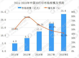 數據顯示,2017年中國3D打印市場規模達到17.5億元,同比增長47.4%。伴隨著中國3D打印技術的相應成熟,在航天航空,汽車等行業需求將持續增加。
