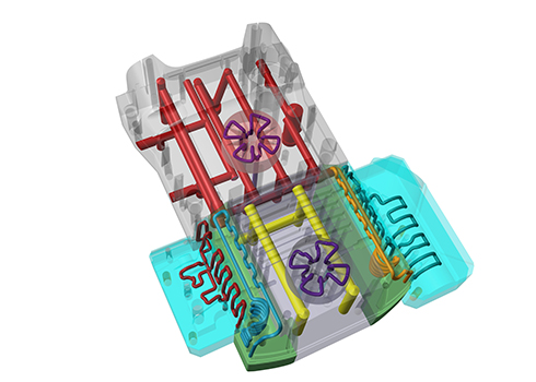 “項目的第一階段是獲取現有模具的數據,以此確定K?rcher提出的目標是否可行,”K?rcher的雷尼紹項目協調人Carlo Hüsken回憶說。雷尼紹利用K?rcher提供的數據繪制出現有注塑成型工序的熱成像圖,然后采用Cadmould? 3D-F模擬軟件進行分析。結果表明,塑材的熔化溫度為220°C,脫模溫度為100°C,而在52秒的整個成型周期內,冷卻時間就占到了22秒。模具溫度用冷卻水進行控制,水流速度為10升/分鐘、溫度為35°C。接下來,雷尼紹對熱成像過程中檢測到的熱點進行重點建模,因為這些區域直接導致成型周期的延長,需要對其進行進一步分析。利用這些數據,雷尼紹完成了一次含有20個成型周期的數據模擬,其中包括對模具壁溫度的分析。