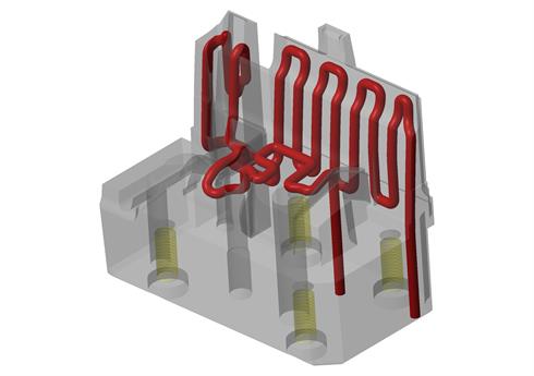根據Hüsken先生的建議,在進行第二次模擬時,雷尼紹改進了噴嘴側的溫度控制方式,即通過在噴嘴側的模具板內加入兩條傳統的冷卻水道,加大對模具板上的鈹銅圓形螺紋接頭的冷卻效果。