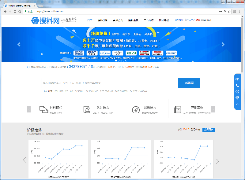 搜料網(m.kanyidian.cn)是廣州搜料信息技術有限公司自主打造的塑料搜索引擎,是以塑膠原料物性大數據為基礎的線上交易平臺,提供選材料、看價格,查庫存、買真料一站式服務。自運營以來,搜料網擁有近萬個注冊用戶,截至目前,線上交易額已突破3億元。