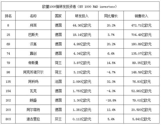 30家歐盟國家企業是全球100強產品研發投資人之一,關鍵在轎車、制藥業和生物科技、ICT、航天航空和國防安全行業。較大 的投資人遍布在法國(688億英鎊),荷蘭(285億英鎊),美國(282億英鎊)和西班牙(141億英鎊)。