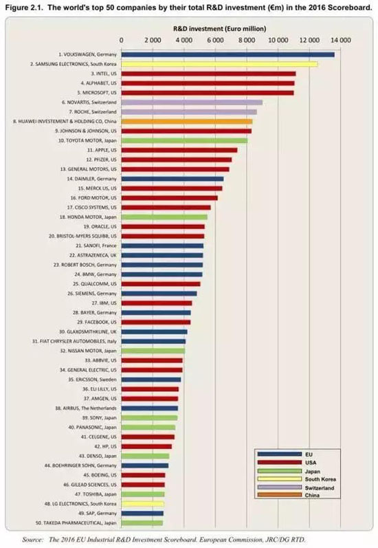 該總榜調查分析了2015-2016財政年度全球2500家公司的研發支出總金額,包括歐盟國家590家,英國837家,日本356家,我國327家,臺灣111家,日本75家,法國58家。