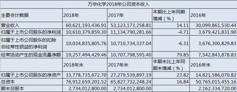 萬華化學2018年報,完成凈利潤106.10億元,同比下降了4.17%??