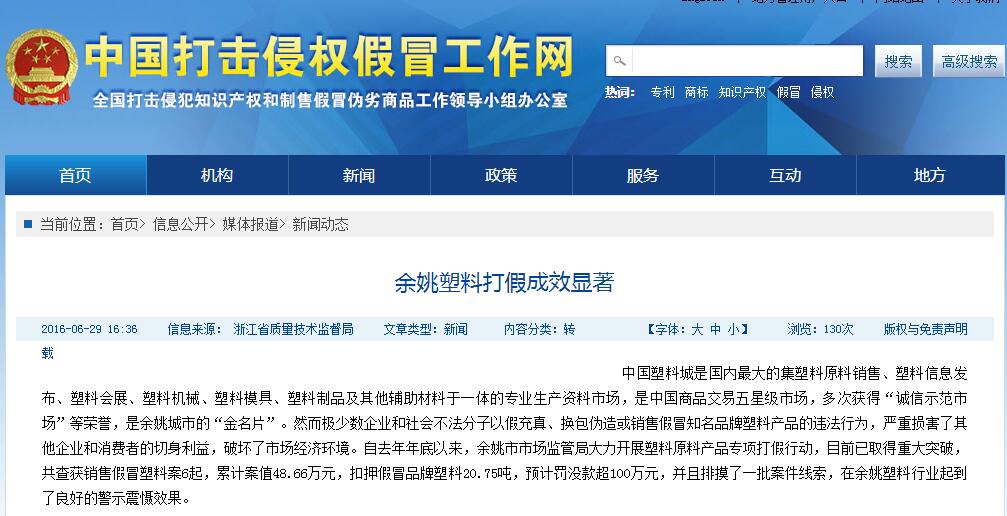2016年上半年就抓獲假冒塑料案6起,累計(jì)案值48.66萬(wàn)元,扣押假冒品牌塑料20.75噸,預(yù)計(jì)罰沒(méi)款超100萬(wàn)元,并且排摸了一批案件線索。