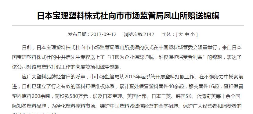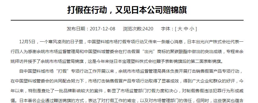 2017年12月,余姚市市場(chǎng)監(jiān)督管理局和中國(guó)塑料城管委收到日本出光興產(chǎn)株式會(huì)社的錦旗,感謝在打擊假冒“出光”商標(biāo)的PC中做出的突出成績(jī),同年日本寶理塑料株式會(huì)社也贈(zèng)予錦旗表彰。