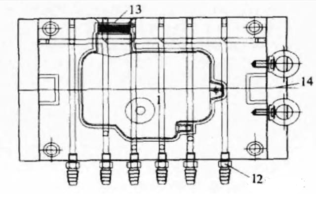 1 、凹模板底版;2 、內六角螺釘;3 、左凹模板;4 、精準定位件;5 、右凹模板;6、7 、打槽固定螺釘;8 、鑲件固定不動型芯;9 、導柱;10 、定位銷;11 、吊鉤;12 、水管快速接頭;13 、進進油口口;14 、球面定位設備