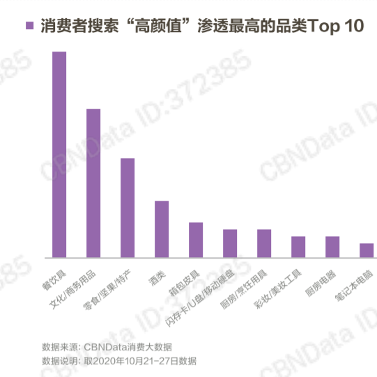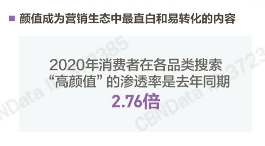 根據第一財經CBNDATA年度網購報告顯示,消費者對于產品顏值的需求正在急速上升。2020整年度消費者在各個品類搜索“高顏值”標簽的滲透率是2019同期的2.76倍。