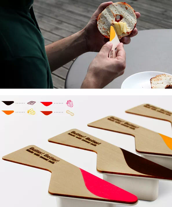 先看一則非常簡單的國外亞馬遜案例:我們想在面包上涂抹黃油的時候,總是會因為一時找不到合適的工具而變得很尷尬。針對此疼點,廠商把包裝盒設計成了涂抹工具的樣子,讓人可以隨時隨地,快樂的在面包上加黃油。