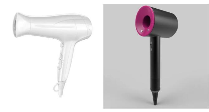 下圖左側就是傳統的有頁式吹風機,如大象鼻子拖著長長的吹風筒。作為區隔,戴森不僅別出心裁地采用了無頁環形設計,紋理上也采用了更時尚的黑色金屬紋理,尤其是那一抹亮艷的紫紅色,濃濃的“黑科技感”撲面而來。
