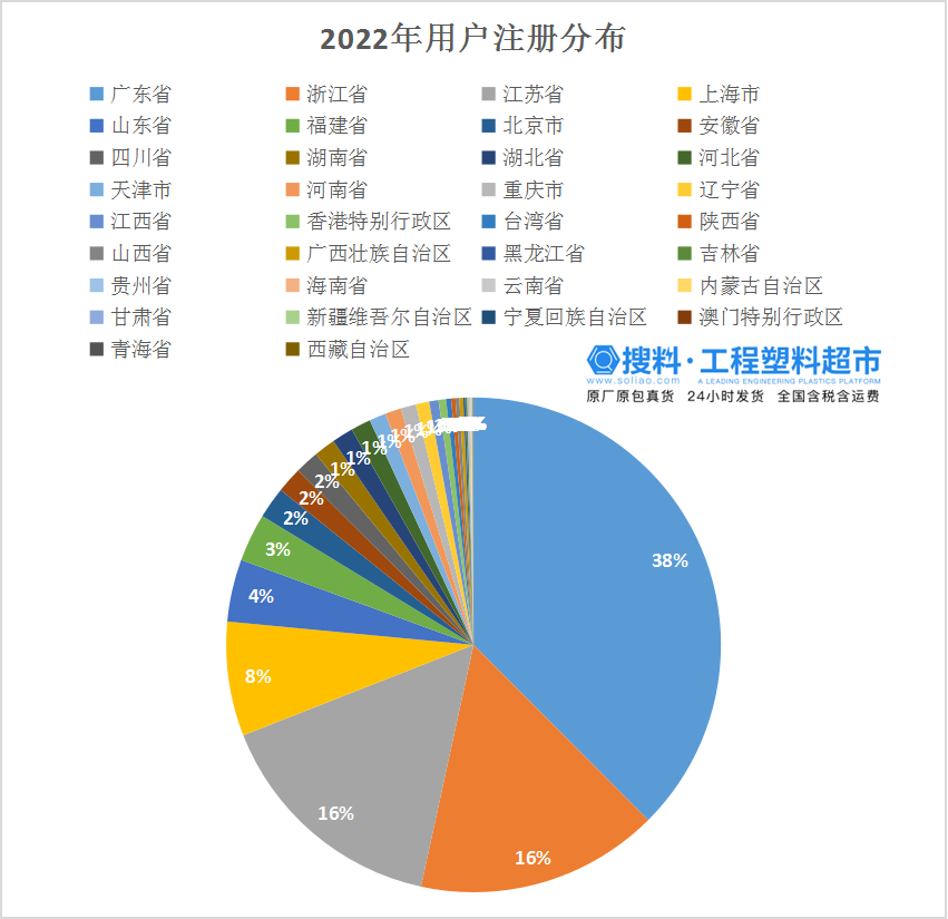 從地域分布來看,2022年塑料互聯網注冊用戶數量排名前五的省份仍然是為廣東省、浙江省、江蘇省、上海市、山東省。廣東和江浙滬是塑料行業數字化踐行者的生力軍,累計占據約60%的塑料網民比例。值得關注的是,相比2021年、2020年、2019年,由于中國其他區域的塑料制造也開始逐步發展,這一比例正在慢慢降低。