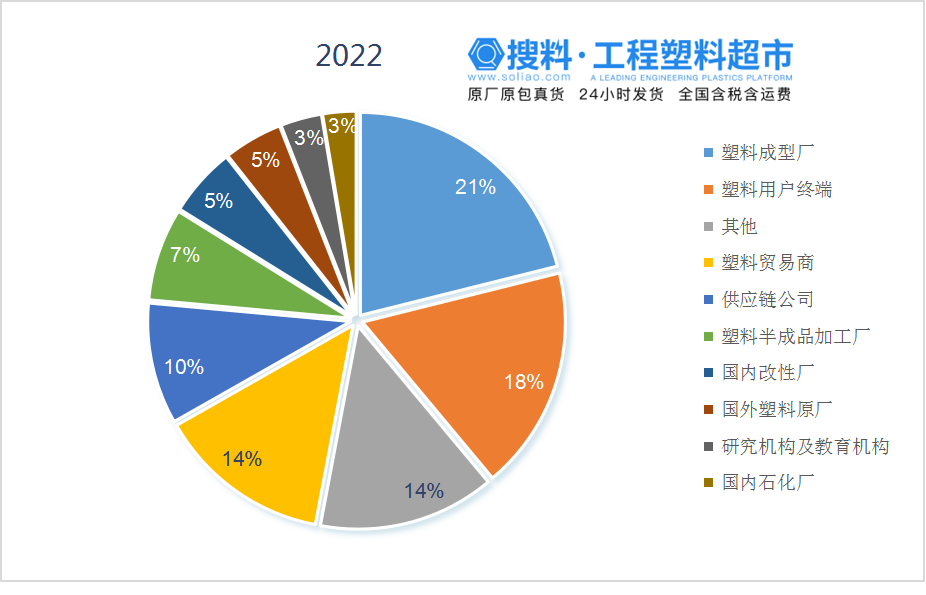 從企業類型來看,2022年及2021年兩年,塑料成型廠(典型代表如富士康)和塑料用戶終端(典型代表如華為)通過互聯網搜料、問料、買料的習慣及趨勢并沒有因疫情受到影響,依舊是塑料產業數字化的主力軍。在這些使用互聯網的塑料行業人員當中,2022年有高達75%是他們各自所在企業的選料用料買料決策者(采購、研發、項目負責人、公司負責人、生產)。一個簡單的例子是,截止到2022年底,華為和富士康都各有123名上述崗位的員工在使用【搜料·工程塑料超市】。