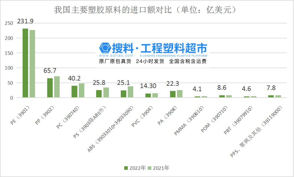 塑料行業從業人員最關心的材料種類與我國2022年對相應品類的進口量高度匹配,證明用戶在【搜料·工程塑料超市】上的檢索行為與其采購決策的正向相關性極大。