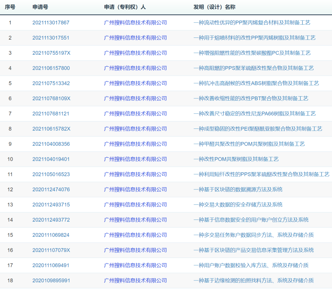 作為行業內超大型的中文塑料數據庫,【搜料·工程塑料超市】收錄了超過100萬個國內外標準的塑料牌號(型號+色號)的相關技術資料。涵蓋物性表、材質證書、加工參數、價格行情、故障排除、應用案例、色號系統、進出口數據等8個維度和拍照找料、超級搜索、一鍵對比、找替代料、認證搜索、汽車搜索、醫療搜索等7個數據加工方式。在國家推崇知識產權保護的政策下,搜料目前累計申請了67個國家發明專利,取得16項軟件著作權,58個注冊商標。