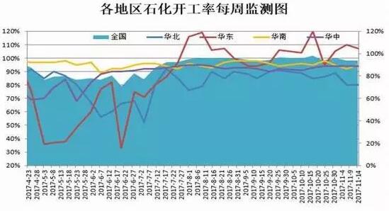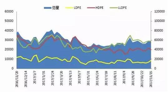 按通常年份,從9月份開始,直到次年3月份,塑料市場因農膜生產而逐漸進入采購旺季。其中,11、12月份為旺季中的小淡季。今年四季度,多了一項環(huán)保限產,規(guī)模以上塑料加工企業(yè)限產50%。這將導致下游需求不及從前,也表現在石化開工率小幅下滑,以及庫存方面的上漲。