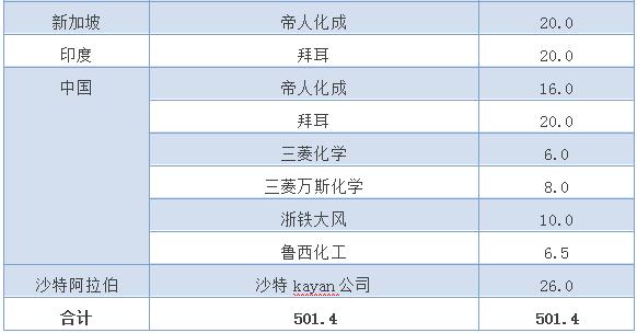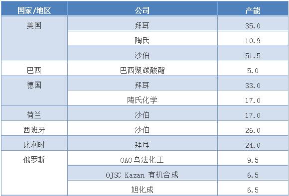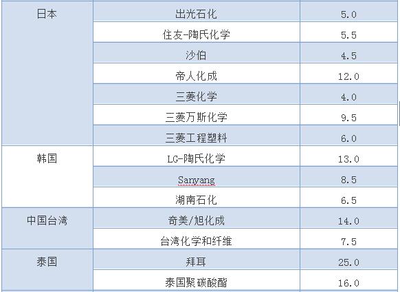 日本Mihara和上海(產能10.2萬噸)都有PC改性工廠;2015年12月,帝人永久性關閉了其在新加坡的22.5萬噸的PC合成裝置 | |||
