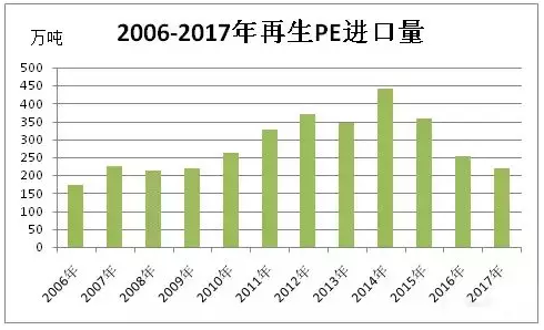 縱觀近幾年再生PE進(jìn)口量,2014年再生PE進(jìn)口總量達(dá)到峰值440.27萬(wàn)噸之后,進(jìn)口量也開(kāi)始下滑。2017年再生PE僅進(jìn)口219.64萬(wàn)噸,降幅13.27%。