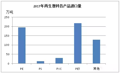 2017年再生塑料進(jìn)口總量在582.91萬(wàn)噸,其中再生PE194.31萬(wàn)噸,再生PS13.85萬(wàn)噸,再生PVC30.39萬(wàn)噸,再生PET216.68萬(wàn)噸,其他再生料127.69萬(wàn)噸。