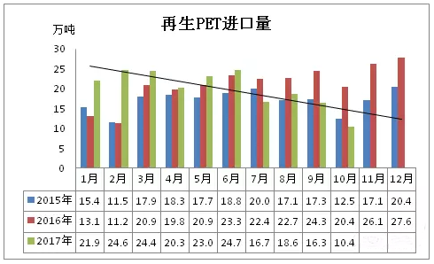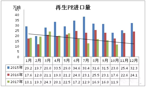 往年單月進(jìn)口量基本在20-35萬(wàn)噸,而2017年單月僅10萬(wàn)噸上下,12月再生PE進(jìn)口量?jī)H6.90萬(wàn)噸。