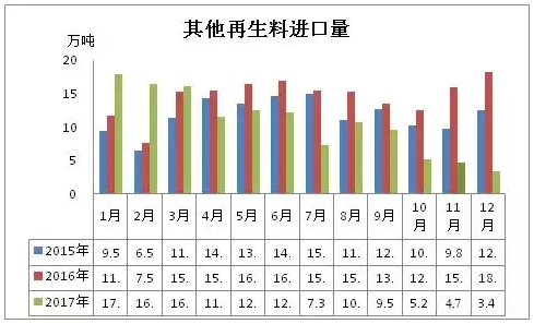 其他再生料2017年也未能擺脫大幅縮量的局勢(shì)。從2017年2季度以來(lái),其單月進(jìn)口量已經(jīng)較往年同期明顯減少,4季度僅在3-5噸上下,12月僅有3.47萬(wàn)噸的進(jìn)口量。