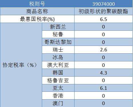 初級形狀聚碳酸酯(39074000),最惠國稅率為6.5%,2019年我國聚碳酸酯繼續執行暫定稅率3%。