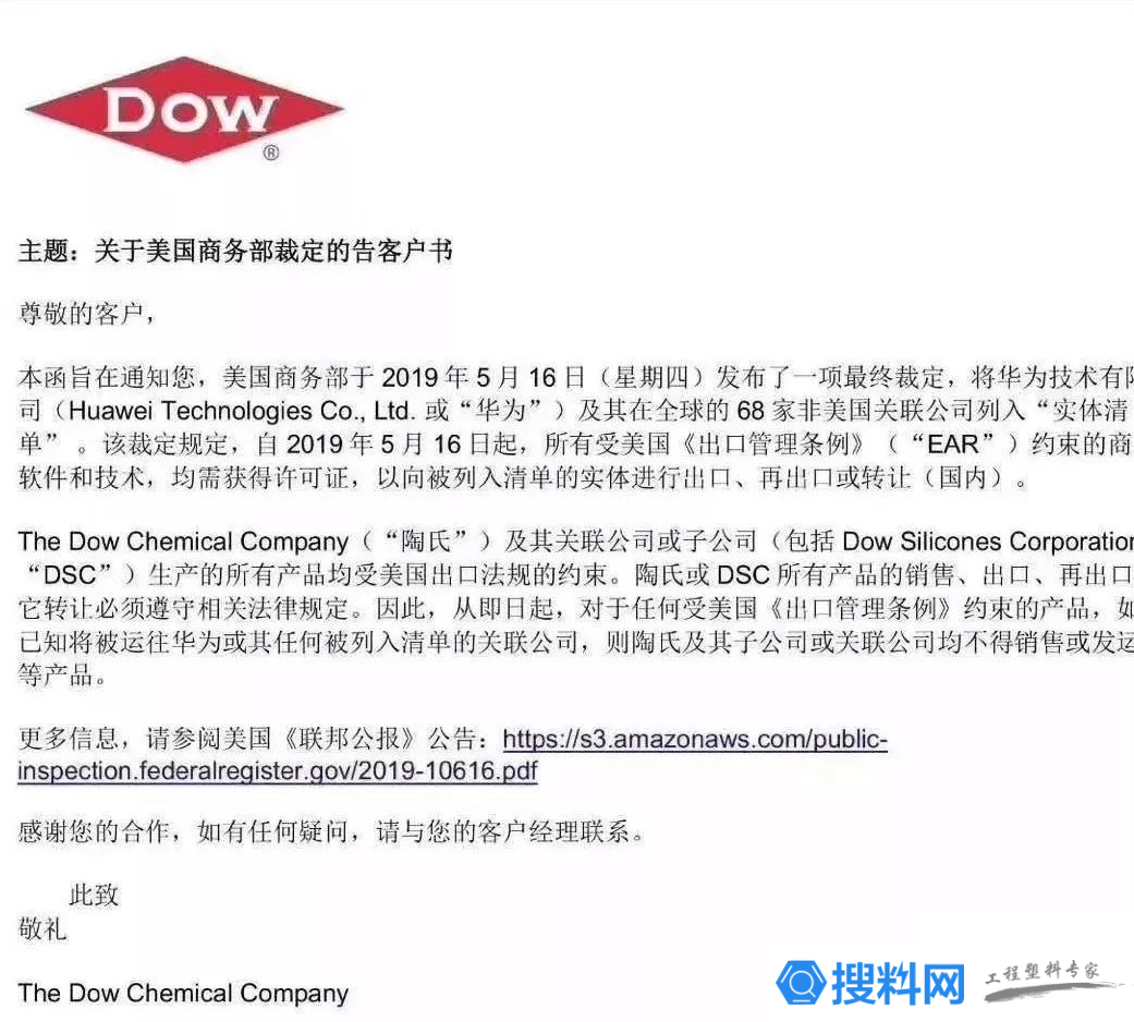 近日,美國化工巨頭陶氏化學(xué)公開發(fā)函宣布對華為斷供。陶氏發(fā)函稱:受美國商務(wù)部裁定華為及其在全球68家非美國關(guān)聯(lián)公司列入“實體清單”的影響,陶氏及其關(guān)聯(lián)公司或子公司(包括陶熙在內(nèi))生產(chǎn)的所有受美國《出口管理條例》約束的產(chǎn)品,將不再向華為或其任何被列入清單的關(guān)聯(lián)公司出售。