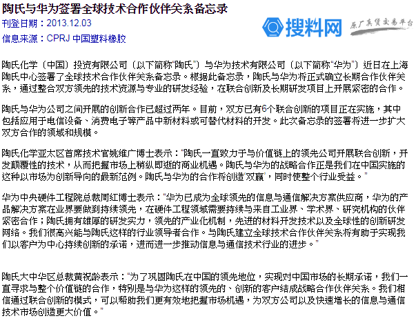 陶氏化學(xué)是全球綜合性化工企業(yè)和有機(jī)硅巨頭,產(chǎn)品涵蓋多類電子化學(xué)品。早在2013年,陶氏就與華為確定了全球技術(shù)合作關(guān)系。如今受美國所謂“實體清單”的影響,陶氏宣布終止與華為的合作,這必定對雙方到來一定的損失。