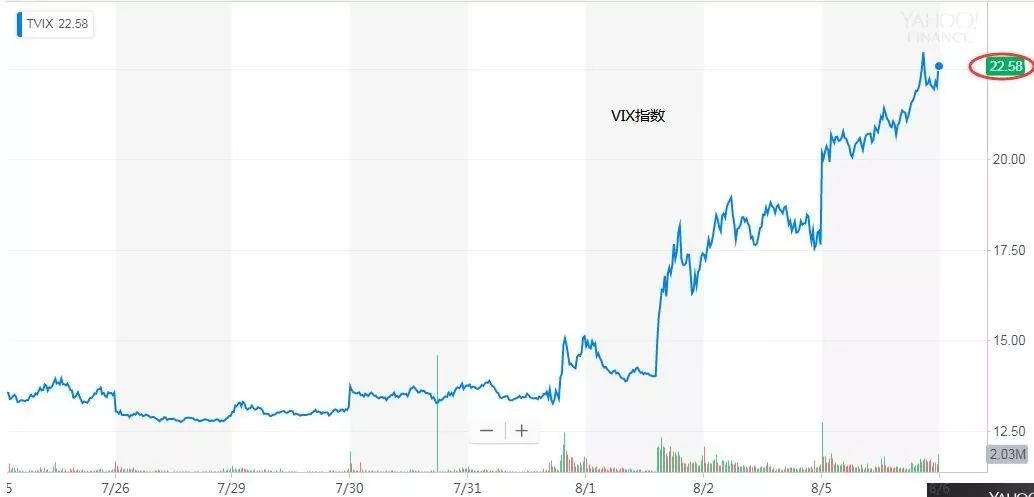 “匯率操縱國”聲明發布后,標普500指數期貨跌逾1%,投資者預期美股開盤將繼續下跌。相對的VIX指數(恐慌指數/扣除恐慌指標,是了解市場對未來30天市場波動性預期的一種衡量方法)一直在攀升,市場避險情緒升溫。