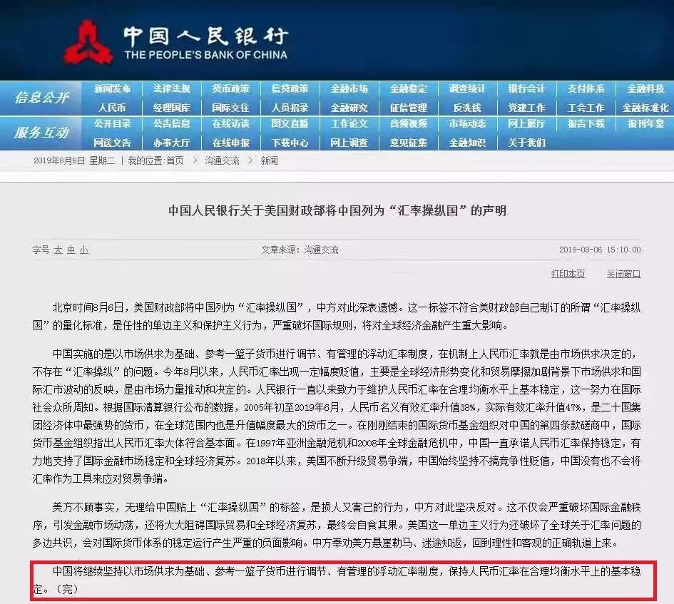 太平洋彼岸的美國比我們緊張,我們前腳匯率貶值,他們后腳給我們貼上“匯率操縱國”的標簽。此舉無疑給緊繃的中美關系附上一層霜,這是美國1994年以來首次給中國貼上“匯率操縱國”標簽。