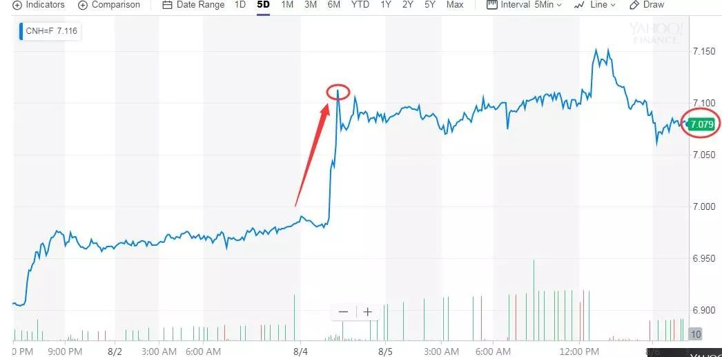上周美國突然宣布對中國3000億出口加征關稅,市場避險情緒升溫,人民幣承壓下行,本周一8月5日上午9點,離岸人民幣兌美元匯率跌破“7”關口。