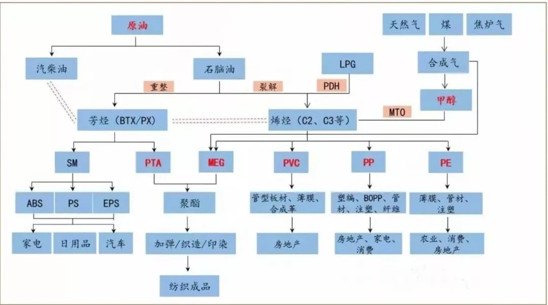 鑒于沙特是中國主要進口原油國之一,國內油價難免飆升,相關產品可能陸續出現漲價。原油之下的汽柴油、石油腦、PTA、烯烴(C2、C3)、SM、甲醇、ABS、PS、EPS、PVC、PP、PE、聚酯、合成氣(天然氣、焦爐氣)等等。