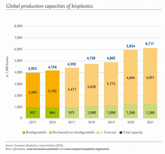 根據歐洲生物協會的數據顯示,到2021年,全球生物塑料行業的生產能力將從420萬公噸將增加到610萬公噸。