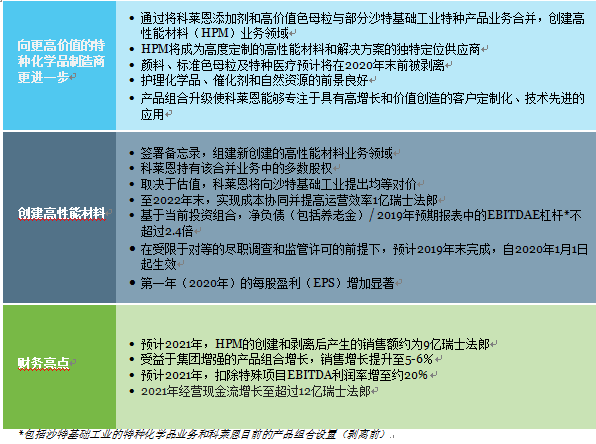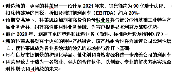 科萊恩將在計劃合并的業務中持有多數股權。雙方將在未來數月決定確定的估值,并以此為基礎,由科萊恩向沙特基礎工業提出均等對價。但這將不會導致科萊恩2019年末預期報表中的凈負債(包括養老金)/ EBITDA杠桿率超過2.4倍(包括沙特基礎工業特種產品業務,但基于剝離前的科萊恩當前產品組合體系),也不會對當前投資等級評定產生影響。在未來數月,科萊恩和沙特基礎工業將就相關業務進行分割,進行對等的盡職調查,并繼續商討交易事宜,以期在2019年上半年簽署最終協議。在監管許可的前提下,交易預計在2019年年底完成,2020年1月1日生效。