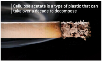 報道舉例了某一香煙屁股污染項目,希望禁止使用醋酸纖維素(Cellulose Acetate)制成的香煙過濾嘴,醋酸纖維素是一種可能需要十多年才能分解的塑料。在每年生產使用此類過濾器的5.6萬億支卷煙中,其中近三分之二的卷煙被隨意丟棄。事實上,自1986年以來,僅收集了6000多萬個香煙屁股。