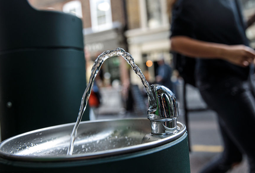 當地時間2018年8月28日,英國倫敦,民眾在公共飲水機旁飲水。倫敦市長近日引進了20個新的公共飲水機,鼓勵人們自帶杯子取水喝,從而減少塑料垃圾。