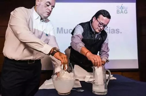 購物袋扔進水里能喝下去?這不是在開玩笑。在智利首都圣地亞哥,面對記者們的“長槍短炮”,智利SoluBag公司總經理羅貝托?阿斯泰特真沒少喝溶進水里的購物袋。