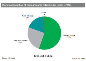 2018年,全球對生物可降解聚合物的需求量是360,000公噸,但IHS預計到2023年,全球生物可降解聚合物的消耗量可增長超過50%,達550,000公噸,這意味著從2018年到2023年這五年間,全球生物可降解聚合物消耗量的年平均增長率可達到9%。