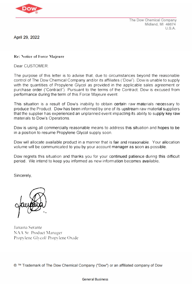 近日,陶氏在客戶告知函中稱,由于公司發生了無法合理控制的情況,陶氏無法提供銷售協議或采購訂單("合同")中規定的丙二醇的數量。根據合同的條款,陶氏在此不可抗力事件的期限內被免除履約。