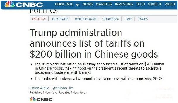 特朗普政府宣布對2000億美元的中國商品將加征10%的進口關稅,中美貿易戰升級。