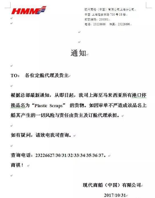 即日起,終止接納全部進口至馬來西亞的廢品海運訂艙,全部海港產(chǎn)品名為“Plastic Scraps”的貨品。如因?qū)弳侮P(guān)不緊導(dǎo)致該產(chǎn)品名登船,其造成的一切風(fēng)險性與義務(wù)由發(fā)貨人及海運訂艙代理商擔(dān)負(fù)!