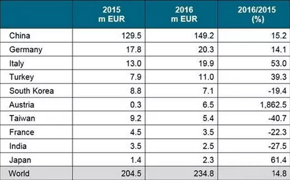 做為將于9月24~27日舉辦的2017年伊朗國際性塑料硫化橡膠工業生產展(Iran Plast2017)的展前加熱,VDMA表明,2016年德國向伊朗出口的機械設備商品額度提高了14%,做到2030萬英鎊(折合2360萬美金),較2015年提高193%。除此之外,在2017年前五個月里,德國對伊朗的機械設備出口額度做到2100萬英鎊(約2440萬美金),較同期相比完成了令人震驚的476.5%的提高。