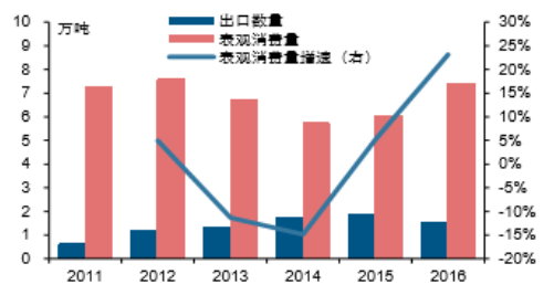 BOPA表觀消費量出現正提高。依據卓創資訊數據信息,2015年BOPA表觀消費量為6.03萬噸級,同比增長率5.24%。繼2012年以后,表觀消費量再次發生正提高。