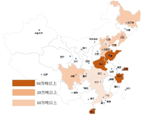 目前,我國規劃產能達到412萬噸,分布在東北、華北、華東、華中、華南、西南,共計14個省市。按裝置產能來看,達產后我國將形成上海、山東、浙江、河南和海南生產基地,地區內產能均超過50萬噸。