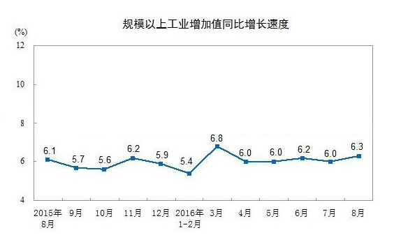 據(jù)中國統(tǒng)計(jì)局全新統(tǒng)計(jì)分析顯示信息,2016年1-8月份,我國規(guī)模以上企業(yè)工業(yè)增加值同比增長6.0%。