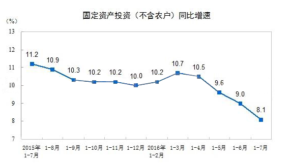 已有人閱讀此文 - -據中國統計局全新統計分析顯示信息,2016年1~7月份,中國固資投資(沒有農民)311694億人民幣,環比為名增長8.1%,增速比1-6月份回落0.9個點。從同比速率看,7月份固資投資(沒有農民)增長0.31%。