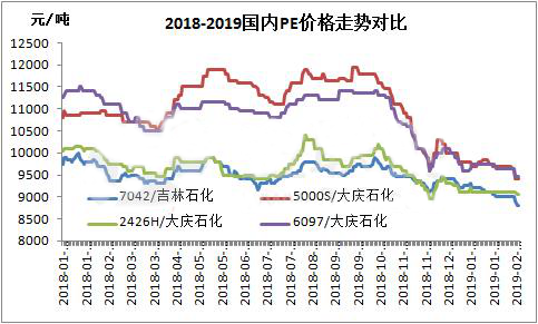 受制于高庫存、低需求,2019年春節后聚乙烯行情迅速走低,華北地區線性8550-8800元/噸,高壓8700-9000元/噸,低壓除中空因資源少相對堅挺外,各產品均有不同程度下滑,拉絲主流8950-9400元/噸,注塑8450-8800元/噸,膜9400-9650元/噸,創下近年新低。下游加工企業一般在元宵節后陸續開工,庫存消化極為緩慢。