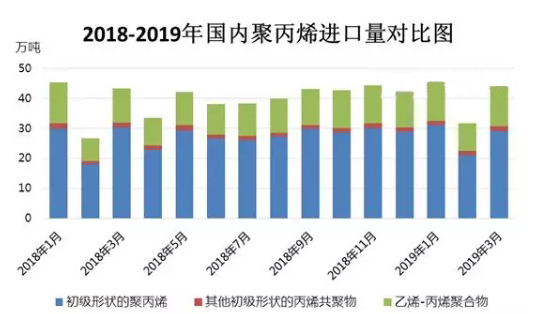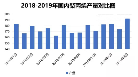 據統計,2019年一季度國內聚丙烯產量在550萬噸左右,環比去年同期增長3.77%。受2018年新增產能釋放影響,2019年供應量增長明顯,同時疊加檢修裝置有限,市場整體供應端壓力不減,尤其3月份聚丙烯產量環比去年增長明顯。