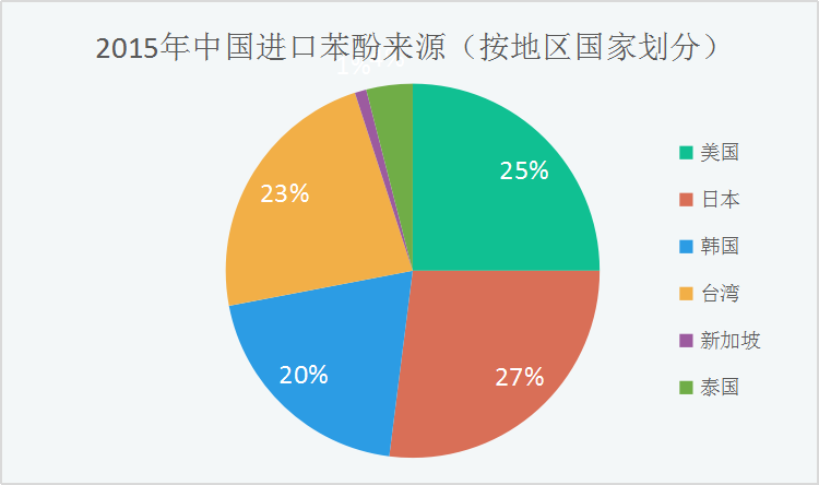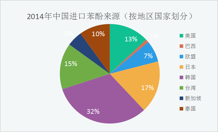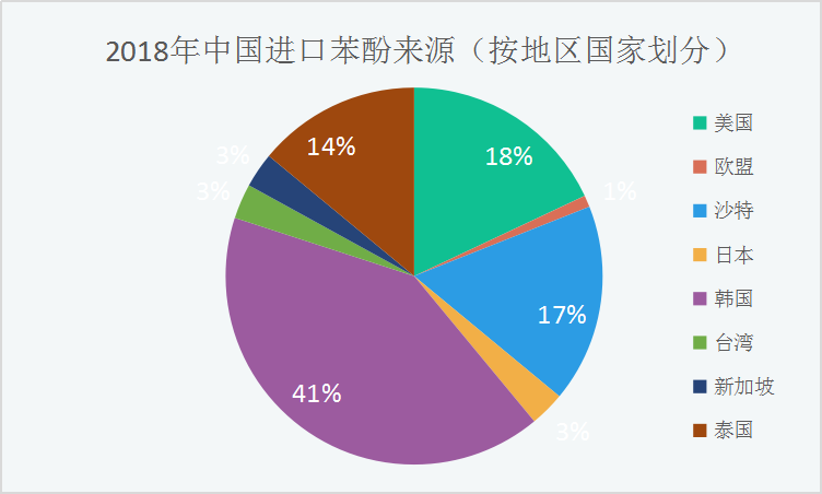 下附2014-2018年中國進口苯酚來源:(按地區國家分)