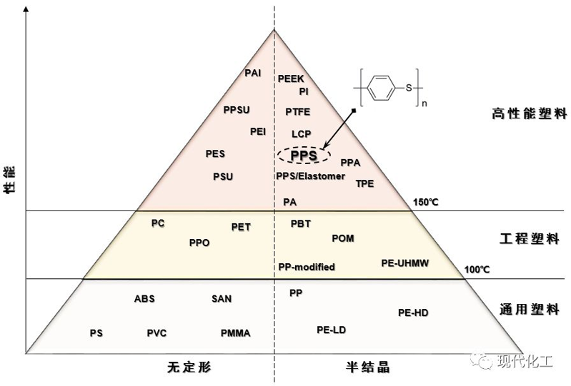 聚苯硫醚(polyphenylene sulfide,簡稱 PPS)又稱聚苯撐硫、聚次苯基硫醚,是聚芳硫醚中最重要且應用最廣泛的一種高結晶度(可達75%)熱塑性樹脂。PPS素有“塑料黃金”之稱,為八大宇航材料之一。 主要塑料種類的分類和性能示意圖見圖。