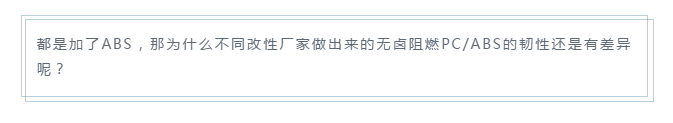 因?yàn)樽枞夹枰瑹o(wú)鹵阻燃PC/ABS必須加入阻燃劑,而無(wú)鹵阻燃劑最常用的是多聚物小分子,比如有機(jī)磷阻燃劑(Mw為幾十到幾百)。這些小分子物質(zhì)的加入,會(huì)使PC/ABS的韌性受到影響。