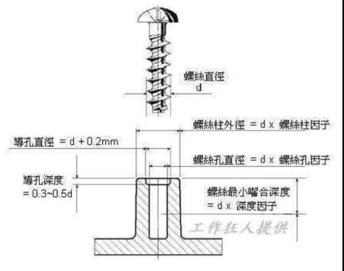 另外,自攻螺絲進(jìn)入時(shí),會(huì)切削出來(lái)塑料碎屑,這些碎屑擠壓可能導(dǎo)致螺絲孔爆裂,所以螺孔長(zhǎng)度必須比螺絲長(zhǎng)度長(zhǎng),以容納被自攻螺絲切削出來(lái)的塑膠屑。